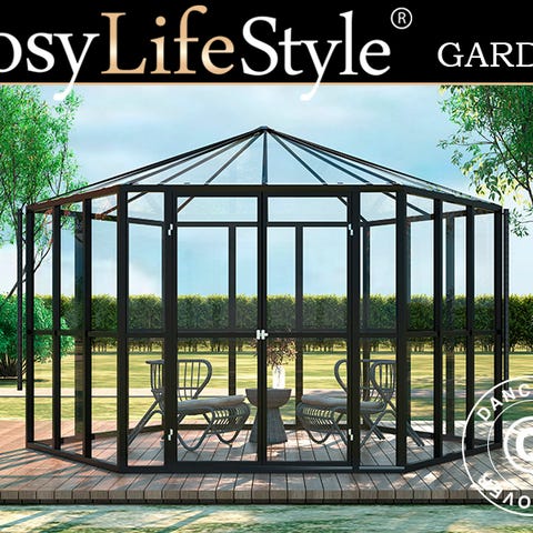 Orangeri, drivhus glas 10,37m², 3,7x3,04x2,8m m/sokkel og tagudsmykning, Sort Produktspecifikationer: