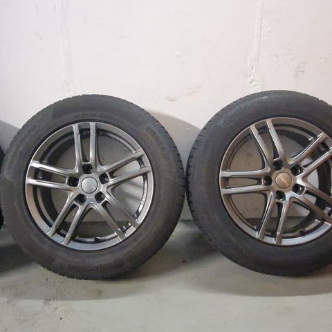 Sælger fire alufælge med brugte vinterdæk. Sælges grundet køb af ny bil. Dækkene har 5 mm mønster tilbage, så der er stadig 1-2 sæsoner i dem. Den ene fælg og dæk har en skade. Vi har kørt med skaden i over et år, men det anbefales kraftigt at få skiftet det dæk, derfor reduceret pris. Nypris for fælge og dæk er 20.388 kr. Passer til VW Tiguan Allspace, SEAT Tarraco, samt andre nyere VW/Audi/Seat/Skoda modeller med samme dækstørrelse (som f.eks. Audi Q3/Q5, VW Touran, Škoda Karoq, Superb, Octavia og Kodiaq. Leverer gerne indenfor en radius af 70 km for 150 kr. for at dække udgifter hertil. Skifter også gerne dækkene på stedet mod betaling 750 kr. BEMÆRK! Dækkene skal efterspændes efter 100 km.