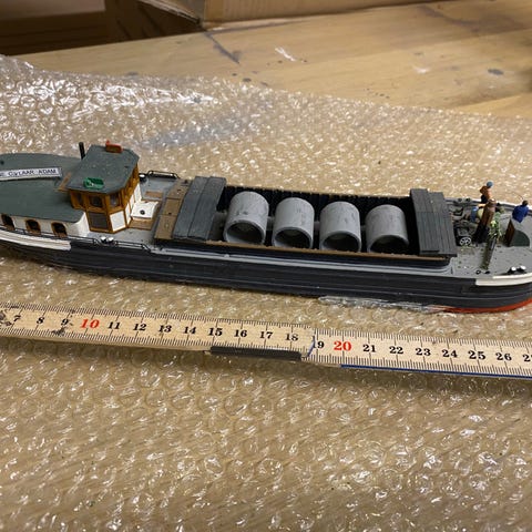 Håndbygget Containerskib størrelse H0 med flad bund. Flot skib til havnemiljø