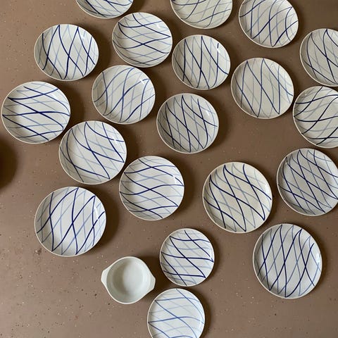 To komplette kuverter med dæktallerken (30.5cm i diameter), middagstallerken (27.5 cm i diameter), forret/frokosttallerken (20,5 cm) og dyb tallerken (23 cm)
