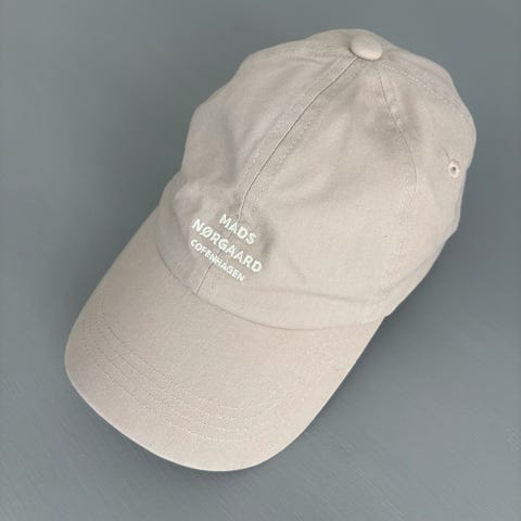 Mads Nørgaard kasket i hvid farve, lavet af bomuld. Kasketten har en størrelse, der passer til de fleste (one size). Aldrig brugt.