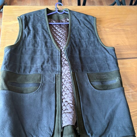 Barbour vest med ternet mønster og læderdetaljer på skuldrene. Vesten har lynlås foran og lommer med klap. Materialet kombinerer tekstil og læder. Ny aldrig brugt størrelse large.