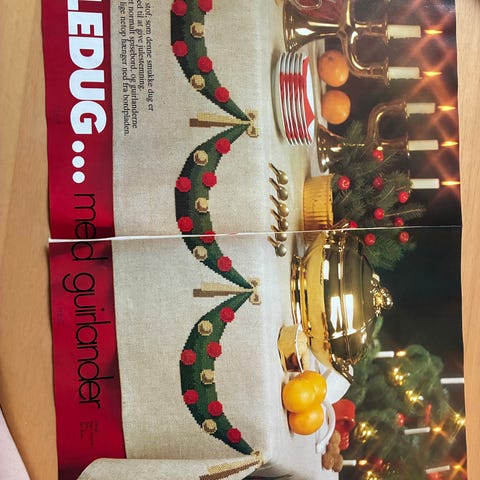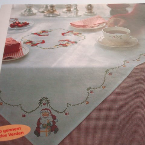 Blå juledug med broderet motiv af klokker, bånd og stjerner i røde, hvide og grønne farver. Dugen måler 1,2 x1,9 , sender gerne