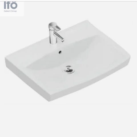 Hvid porcelæn håndvask med krom armatur. Vasken har et enkelt hanehul og tilslutningsslanger til vand. Velegnet til badeværelse eller gæstetoilet.