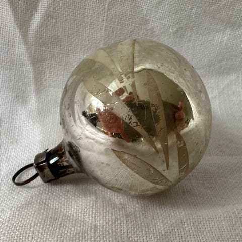 1 stk. Ældre dato glas juletræskugler Julepynt, Gamle Ældre hvid Julekugler med motiv og Sølvglimmer, Ældre Retro Juletræspynt til samle, fejler intet, kan hentes for 50 kr.