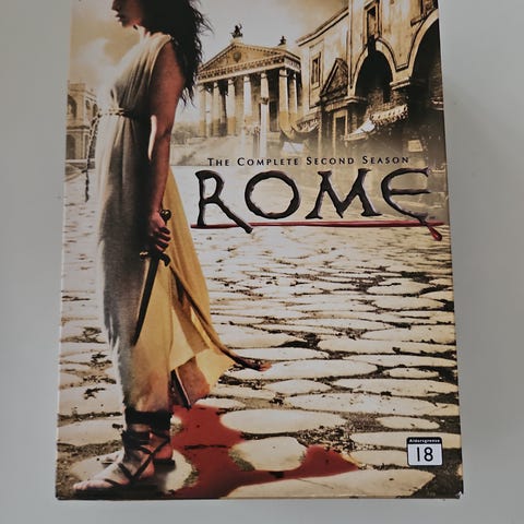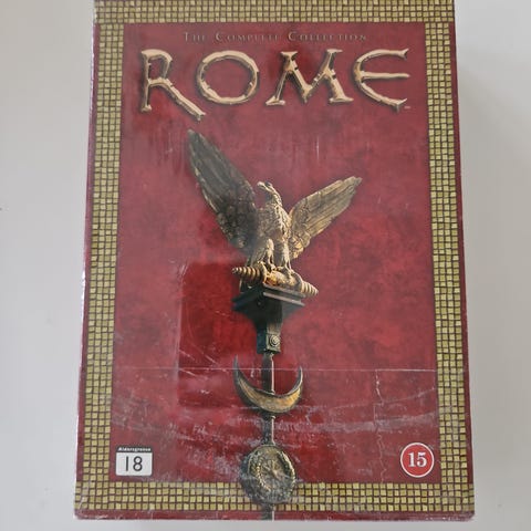 Rome The Complete Collection DVD box set indeholder 12 episoder fra tv-serien Rome. Sættet inkluderer en opbevaringsæske med illustrationer og DVD-disc med serien. Egnet til samlere og fans af historiske tv-serier.