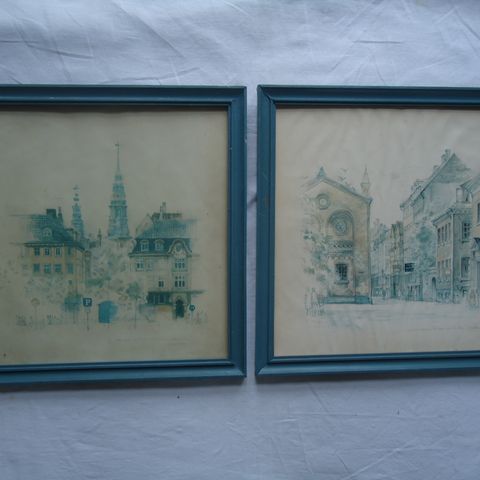 Skøn Mads Stage tegning af gammelt byhus i afdæmpet farvepalet. Indrammet i egetræsramme og klar til ophæng i sommerhuset måske?