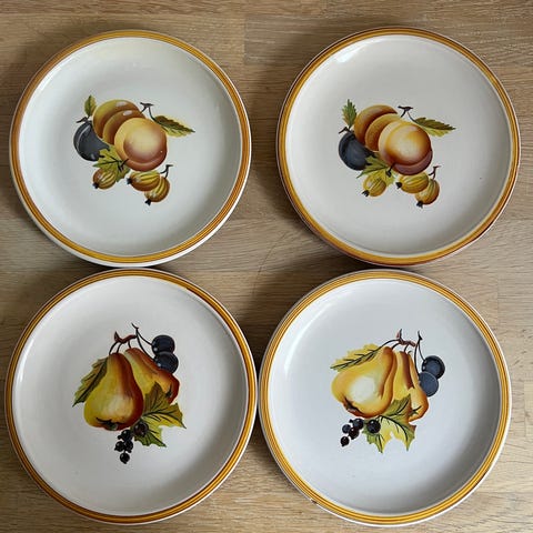 5 fine vintage tallerkner, små fade m frugt motiver. Fra Knapstrup keramik