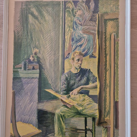 Aksel Jørgensen ( 1883 - 1957) var dansk grafiks store mester og inspirator for mange danske kunstnere. Hans kendte selvportræt er signeret i bly og gengivet i alle bøger om Aksel Jørgensen. 28 x 35 cm. Ydermål for ramme 40 x 50 cm. Desuden portræt af maleren Joakim Skovgaard b: 23,5 h: 31,5. Sign. i bly. Ydermål for ramme med glas er 50 x 60 cm. Skal afhentes.