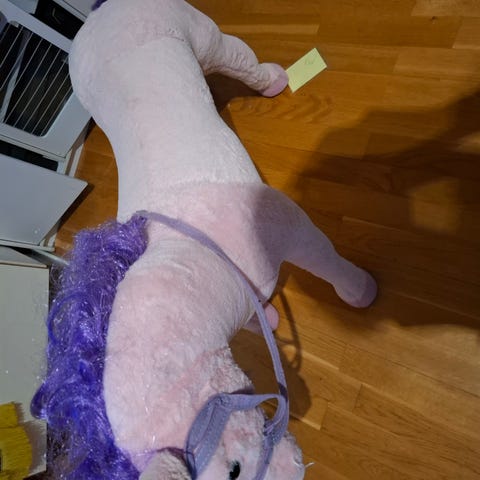 Legen bliver meget sjovere med denne naturtro plysenhjørning, som barnet kan sidde på!