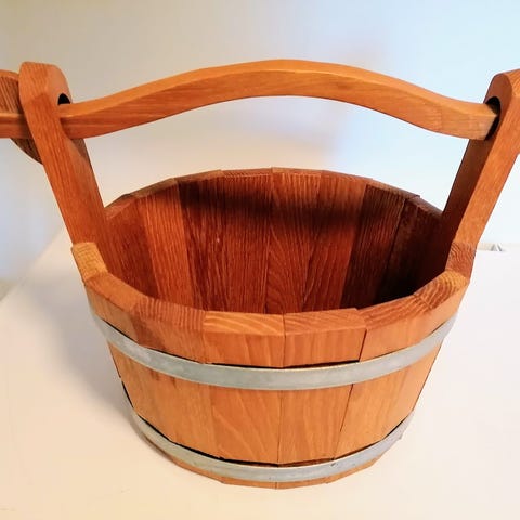 Saunatilbehøret, der består af en spand, en plastindsats til spanden, en ske, et timeglas og et termohygrometer, er et musthave-sæt til saunaen.