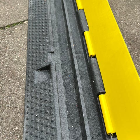 Ramperne er lavet af gummi, som er let, slidstærkt og holdbart. Ramperne er farvet i klar gul og har advarselssymboler på overfladen for at gøre den mere synlig. De har et enkelt kanalspor hver til at styre og beskytte dine kabler og kan bære en maksimal vægt på 5 tons. Kablet kan nemt placeres eller fjernes ved at vippe topdækslet op. Takket være det modulære design kan flere ramper forbindes for at få plads til længere kabler.