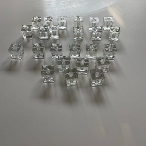 Glas, 12 glas lysestager til tynde lys, Retro, 12 glaslysestager til tynde lys. Måler 5 cm i bredden og 2 cm i højden.