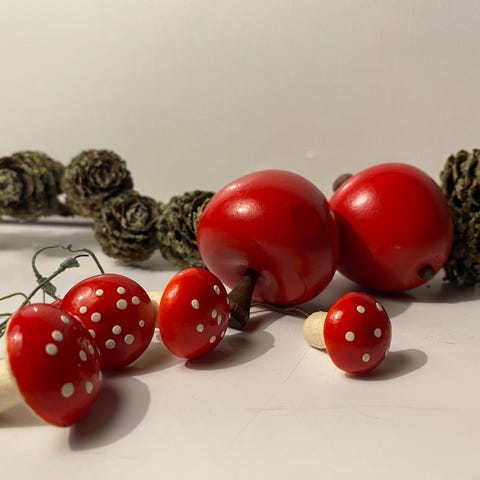 Hånddrejede julepynt og andre pynte ting i træ.