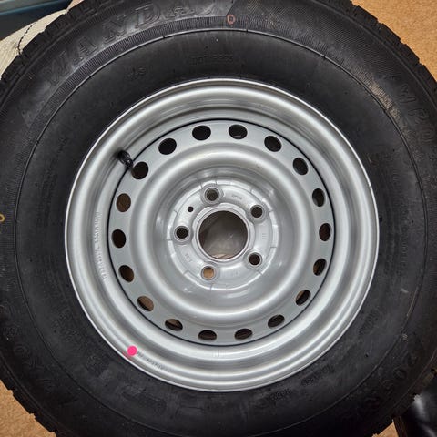 Fælge 14", 5 x 112, Indpres 30, med dæk 205/70, til campingvogn, evt reservehjul; HAR ALDRIG KØRT. Passer bl.a til Dethleffs