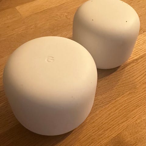 Google Nest Wifi mesh netværk/ Google Nest Wifi Router i hvid, med strømforsyning og netværksporte til kablet forbindelse. Designet til at skabe et trådløst netværk i hjemmet eller kontoret.