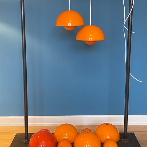 To originale Flowerpot pendler designet af Verner Panton fra 1987. Med originale mærkater. Der er tale om de originale i kraftig emalje fremfor det tynde blik, som nu nutidige lamper fra Verpan er lavet af.