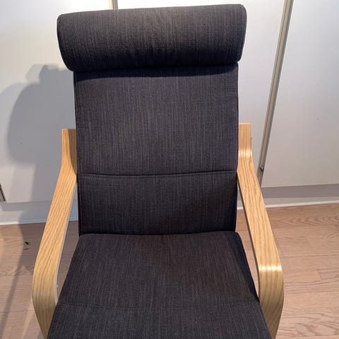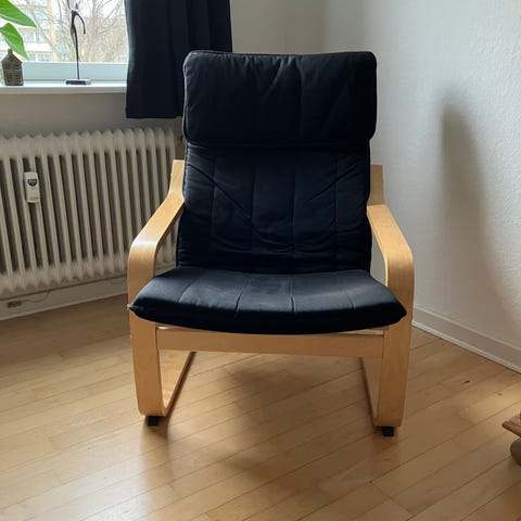 Dejlig sort POÄNG lænestol (ældre model) fra IKEA som gynger når man sidder i den. Der er tegn på slid på bagsiden men det kan let males over med lidt sort maling. Stof kan udskiftes ved at købe et nyt i ikea (POÄNG model). Et ekstra plus er også at stoffet kan tages af og vaskes ☺️. Jeg er åben til forhandling af pris.
