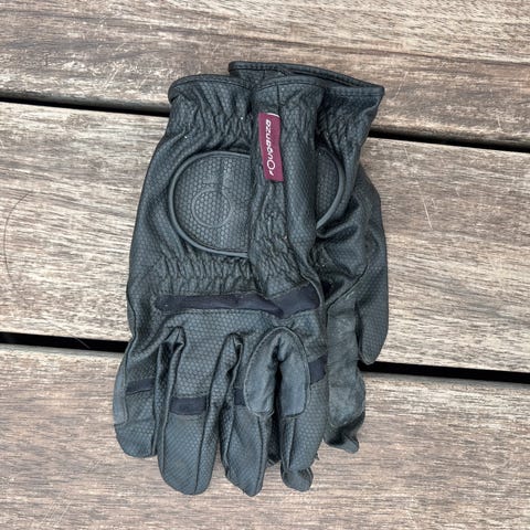 Et par cavalleria Toscana ridehandsker i sort, og et par montar ridehandsker i hvid. De har justerbare lukninger. Materialet er blødt og fleksibelt for komfort og bevægelsesfrihed. Vaskes inden afsendelse.