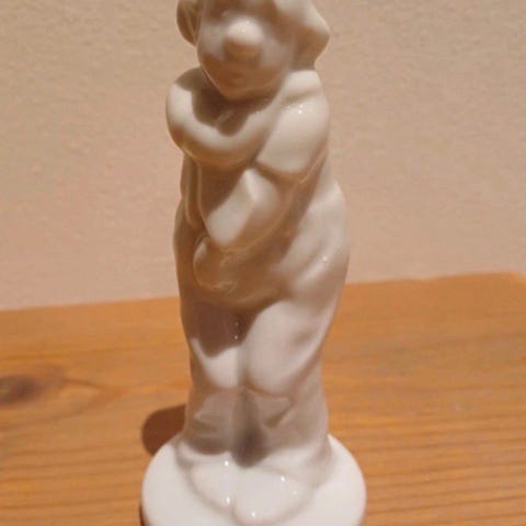 Meget dekorativ og anderledes skulptur, lavet af metal, formentlig bly, sort og sølvfarvet dragt. Klovnen står på en brosten og har udtryksfulde træk og bevægelser.