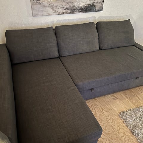 IKEA FRIHETEN hjørnesofa med opbevaring i mørkegråt stof. Sofaen har en funktion som sovesofa med udtræk og opbevaringsplads under sædet. Velegnet til stue, teenager- eller gæsteværelse.