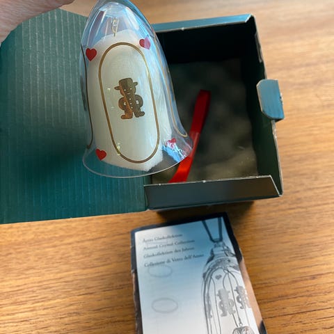 Holmegaard årsklokker 1993, 1994 og 1998 med juledekorationer i glas med ophængningssnor.