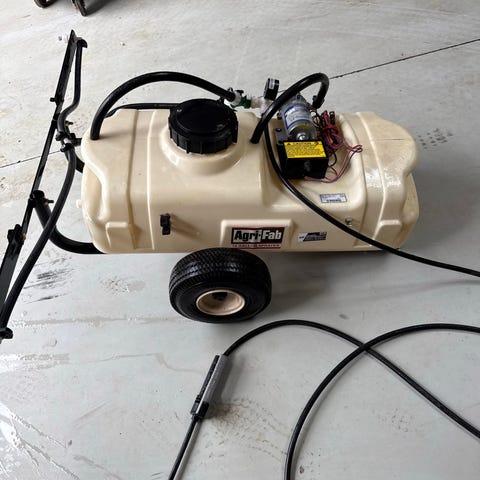 Wiedenmann motoriseret sprøjte med gul tank og hjul. Maskinen anvendes til sprøjtning af større arealer efter evt. havetraktor