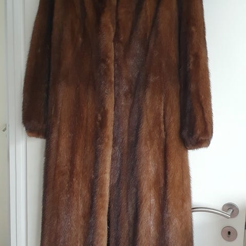 Smuk minkkåbe som ny, specialsyet i hele skind. Kantet med 4,25 cm flæse, der er 40 cm bred.