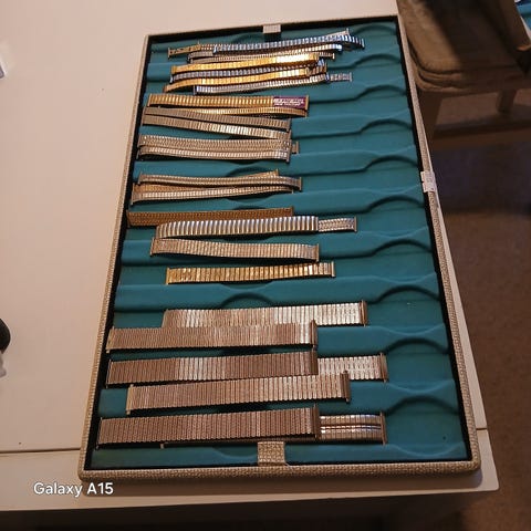 Urremme i guldfarvet metal designet til unisex brug. Indeholder forskellige størrelser og stilarter af metalremme egnet til armbåndsure.