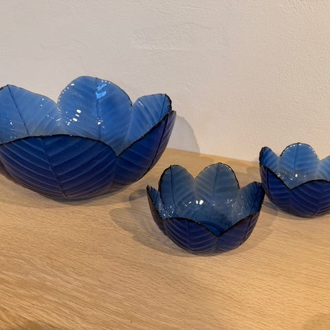 glas skåle med blå kant. Skålene er fremstillet i klart glas med en blå kant og fod. Designet til servering og dekoration.