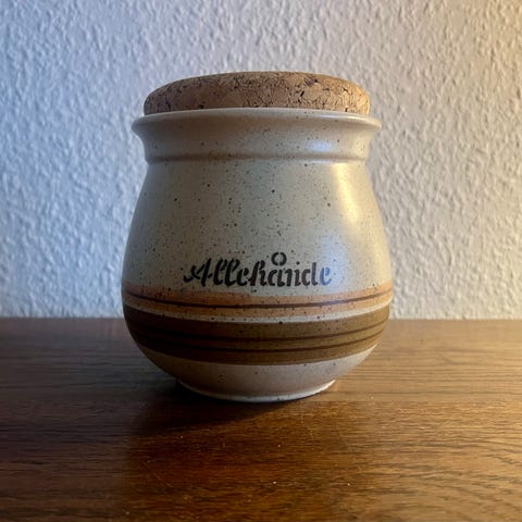 En tidstypisk retro-krydderikrukke og samlerobjekt samt søde Hjort keramikting fra Bornholm. Der er nogle “gnavemærker” i proppen - deraf prisen