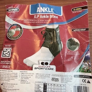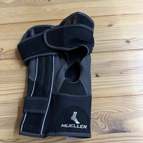 Mueller knæstøtte med åbning ved knæet og justerbare stropper for fastgørelse. Fremstillet i sort materiale med polstring omkring åbningen. Designet til støtte og stabilisering af knæleddet.
