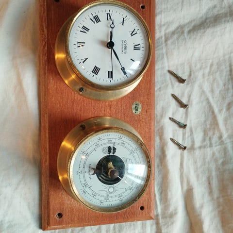 Anker barometer og ur med hvid urskive og romertal. Urene er indkapslet i en rund messingramme med låsebeslag. Barometeret viser tryk i forskellige vejrindikatorer som Rain, Fair og Storms. Urene har klassisk design og kan anvendes til indendørs brug som dekorative og funktionelle instrumenter.