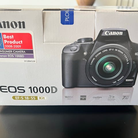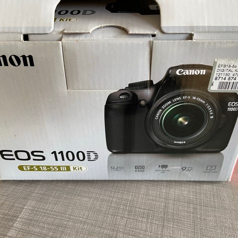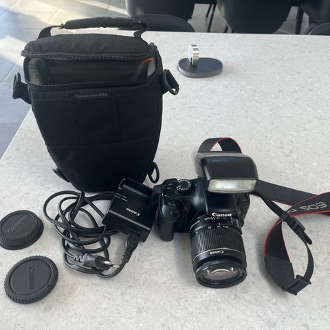 Canon EOS 1100D Digitalkamera med medfølgende kamerataske. Kameraet har en standard zoomlinse monteret og er designet til fotografering i forskellige situationer.