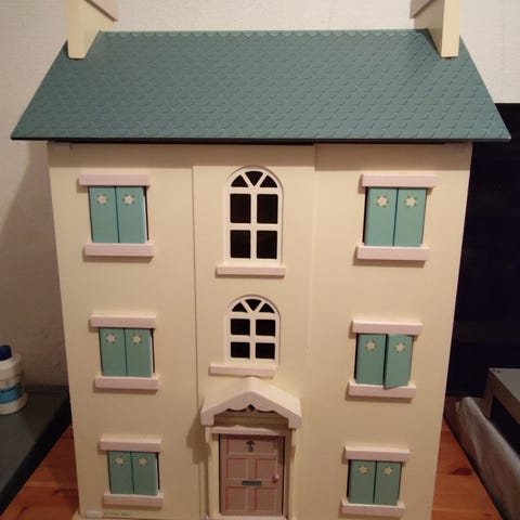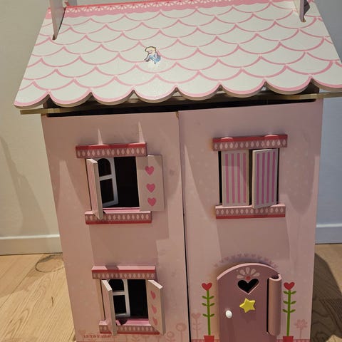 Super fint dukkehus, som er leget godt med og derfor også har lidt slid. Døren mangler. Ellers fungerer alt fint :)