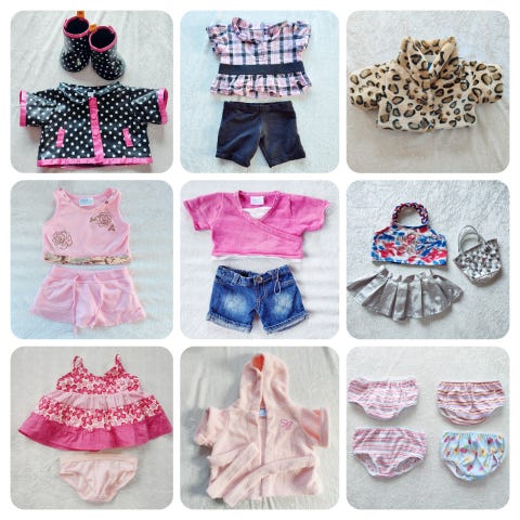 Build-A-Bear bamse tøj bestående af en pink overdel med sorte stropper og en sort nederdel med pink prikker.
