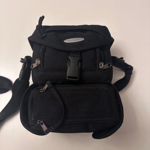 Olympus E-System kamera taske i sort farve med polstret orange indre. Tasken har justerbare rum til opbevaring af kameraudstyr og en justerbar skulderrem for nem transport.