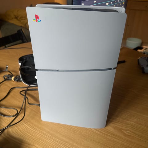 Playstation 5 spilkonsol med standard hvid og sort design. Konsollen er beregnet til hjemmeunderholdning og spil.
