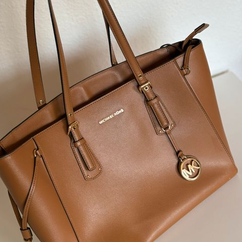 Michael Kors taske i stof til kvinde. Tasken har en beige farve med brun justerbar rem og metaldetaljer. Egnet til daglig brug og til at bære personlige ejendele.