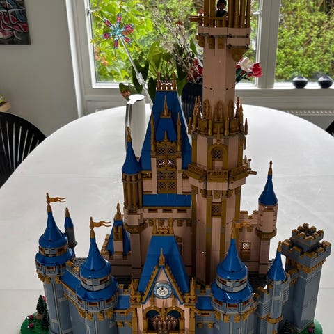 Superfint LEGO Disney slot legetøj i 4 etager med detaljerede tårne, flag, vandfald og palme.