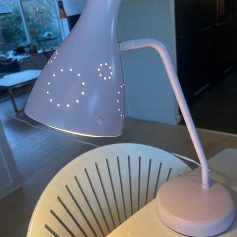 Fin pink bordlampe, perfekt til børneværelset. Lampen giver et behageligt lys og er god at bruge som natlampe eller læselampe. Den virker som den skal og er i god stand. En hyggelig og praktisk lampe, der passer godt ind på ethvert børneværelse