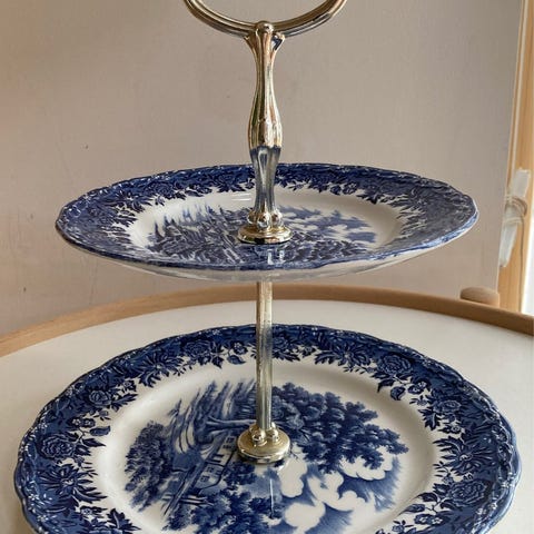 Smuk kageopsats med 2 tallerkener. Højde ca. 25 cm. Nederste tallerken er ca. 20 cm i diameter - øverste er ca. 16 cm. Stellet hedder Quiet Day fra W. H.Grindley - engelsk fajance. I pæn og hel stand. Kan afhentes 8381 Tilst eller sendes + forsendelsesomkostninger.