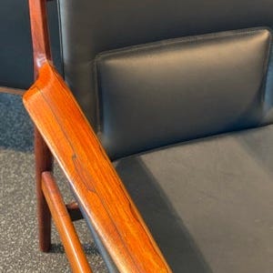 Arne Vodder armstol udført i palisander og betrukket med bordeaux læder. Umiddelbart ingen stempler/mærkater synlige. (Sædehøjde 45 cm sædebredde 55 cm sædedybde 49 cm ryghøjde 79 cm ) I flot stand med småskrammer