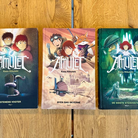 Kazu Kibuishis “Amulet” tegneserieserie, bestående af flere bind, præsenterer en fængslende fortælling. Bøgerne er udgivet i paperback-format med farverige omslag og illustreret indhold, der henvender sig til læsere med interesse for fantasy og eventyr.