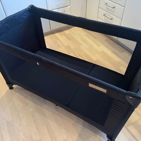 Cam Cam Copenhagen Rejseseng i mørkeblå med mønster. Bærbar og foldbar børneseng, velegnet til rejser og midlertidig brug..kan lynes op i den ene ende , så barnet kan kravle ud , den kan også bruges som hule
