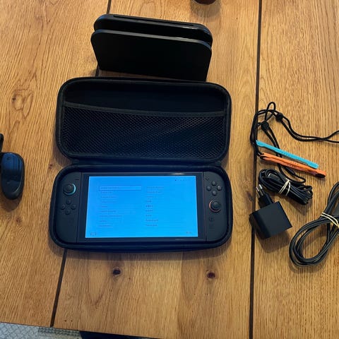 Nintendo Switch konsol med to Joy-Con controllere i sortf. Konsollen har en bærbar design, der gør den egnet til både stationær og mobil brug. Velegnet til gaming på farten eller hjemme.