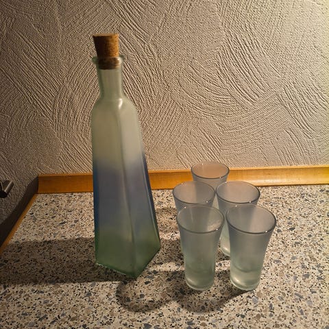 Sæt med fire snapseskeer og en flaske.