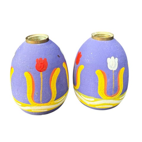 Mogens Eigenbrod håndmalet lysestager sæt fra Bogense, Danmark. Lysestagerne er dekorative med rød, hvid, gul og grøn farve, og har et unikt blomsterdesign.