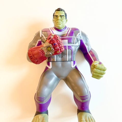 Marvel Thanos actionfigur med detaljeret Infinity Gauntlet. Figuren er designet med guld- og lilla farver og viser karakterens ikoniske rustning og hans kraftfulde handske med alle Infinity-sten.