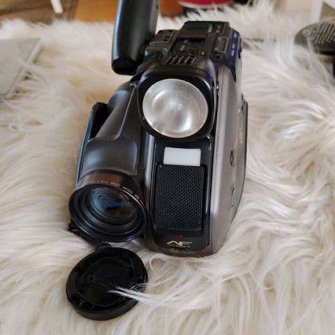 INF Luxor 9238 videokamera med indbygget skærm og forskellige tilslutningsmuligheder. Kameraet har manuel kontrol for optagelse og zoom, og leveres med tilbehør som batteri, oplader, kabler og bærepose. Velegnet til optagelse af video i forskellige situationer.